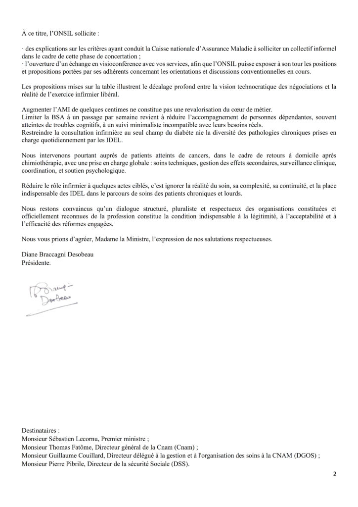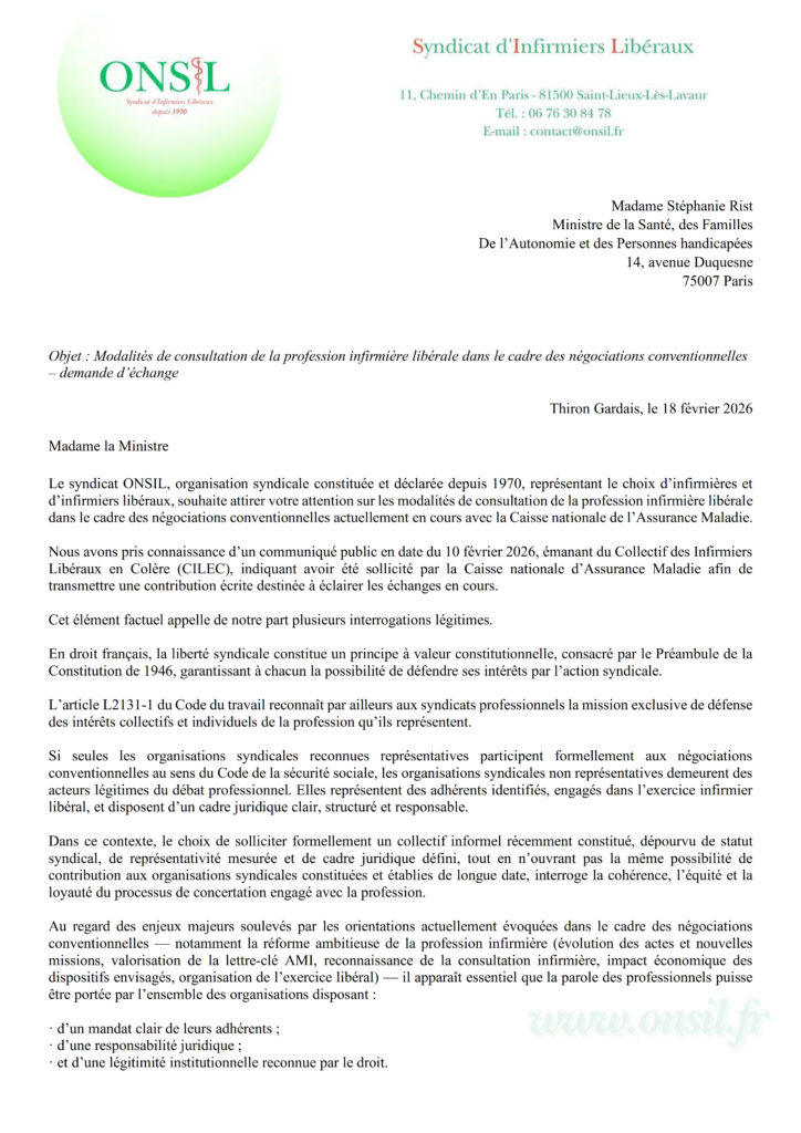 Négociations conventionnelles : l’Onsil saisit les pouvoirs publics sur la consultation des IDEL Courriers adressés le 18 février 2026 à la Ministre de la Santé,